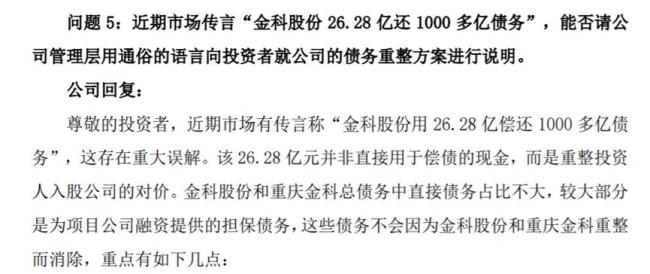 针对市场传言“金科股份26.28亿还1000多亿债务”,金科管理层回应称存在重大误解。这26.28亿元是重整投资人入股公司的对价,并非直接用于偿债的现金。金科股份和重庆金科总债务中直接债务占比较小,大部分是为项目公司融资提供的担保债务,这些债务不会因母公司重整而消除。