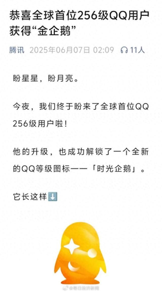全球首位256级QQ用户获得“金企鹅” 挂机达人成就传奇!6月7日凌晨,腾讯官方公众号宣布,QQ昵称为“爱芥末”的用户成为全球首位拥有金色“时光企鹅”等级图标的用户。这也是全球首个达到256级的QQ用户。