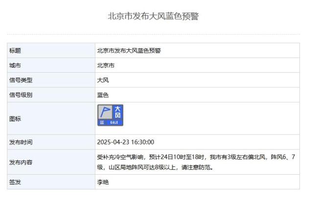 北京市气象局发布大风蓝色预警,受补充冷空气影响,24日10时至18时,北京将有3级左右偏北风,阵风可达6、7级,山区局地阵风可能超过8级。请大家注意防范