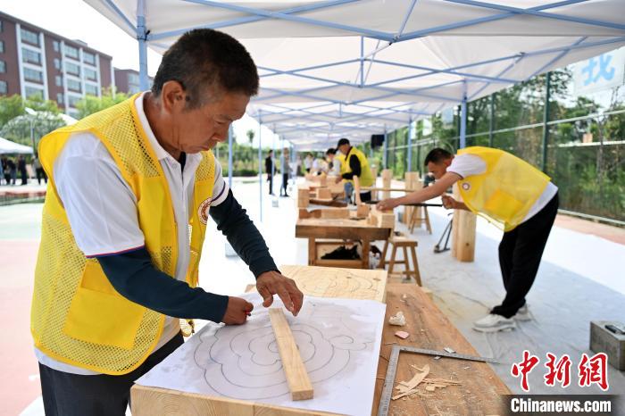 5月22日,西北四省(区)文物保护工匠技能竞赛暨甘肃省第一届文物行业职业技能竞赛在甘肃兰州举行。图为参赛选手沈明三进行木作文物修复竞赛项目。九美旦增 摄