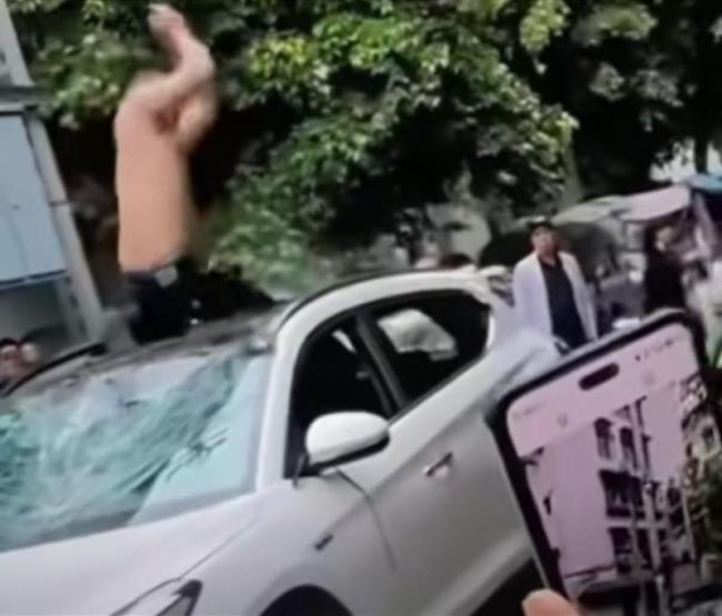 视频显示,一名赤裸上身的男子跳上白色小车引擎盖,挥舞工具打砸玻璃,警方随后到场将其按倒在地。