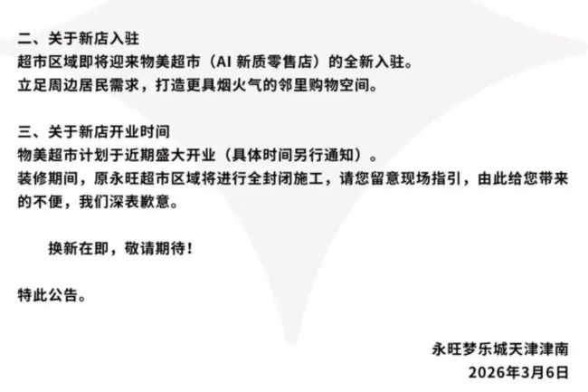 三家永旺3月6日晚发布超市区域店铺换新告知公告,物美超市(AI新质零售店)将全新入驻,并计划近期开业,期间原永旺超市全封闭施工。