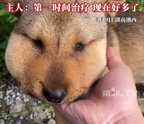 5月11日湖南湘西。小黄狗半夜上山玩,不慎被蛇咬伤脑门,肿成表情包,主人:第一时间喂药,马上给它排毒,现在情况好多了,这已经是小黄狗第二次被蛇咬了。...