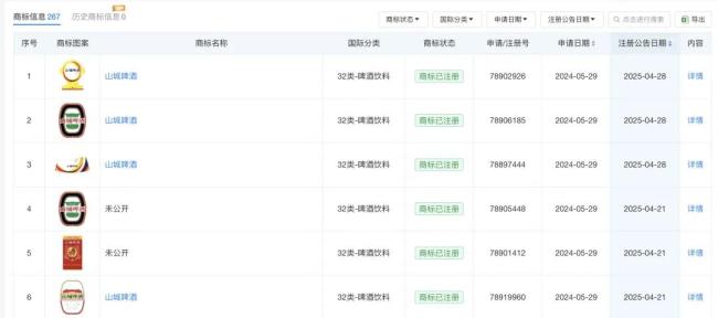 据中国商标网数据显示,自2024 年以来,该公司已累计提交 15 件 “山城啤酒” 商标申请,涵盖不同设计样式和类别。