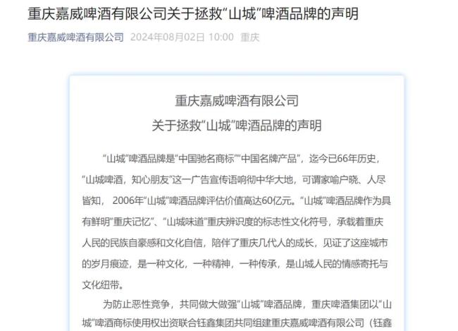 2024 年8月,嘉威在公众号上发布《重庆嘉威啤酒有限公司关于拯救 “山城” 啤酒品牌的声明》将双方的矛盾彻底公开化,引起大众热议。
