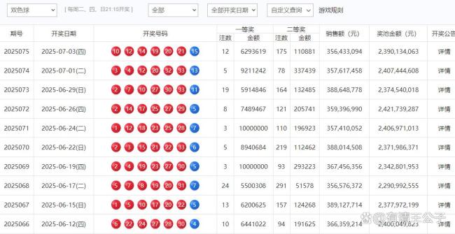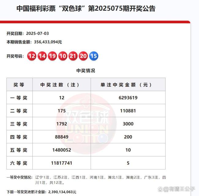 3连号!双色球开出12注629万元 8省共享千万大奖!2025年7月3日晚,中国福利彩票双色球第2025075期开奖结果揭晓。本期开奖号码为红球10、12、14、19、20、21,蓝球15。全国销售总额达3.56亿元,一等奖共中出12注,单注奖金629万元,奖池累计至23.9亿元,创近期新高。