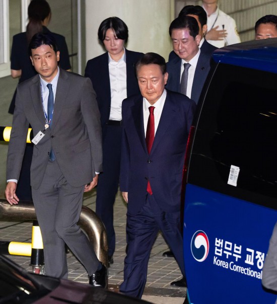 7月9日晚,韩国前总统尹锡悦接受讯问后走出首尔中央地方法院。新华社/纽西斯通讯社