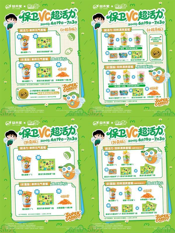 本次联名活动以“健康双补给”套餐为核心,巧妙推出单杯元气套餐与双杯清爽套餐。消费者在小程序下单,购买单杯橙C胡萝卜或者橙C胡萝卜搭配胡萝卜芒芒椰/粉黛苹果,可获得超活力发泡贴纸、卡套挂件等限定周边。令人惊喜的是,上小程序还能参与“疯狂的萝卜”活动,有机会赢取益禾堂黄金纪念币;外卖平台则提供更灵活的饮品组合,购买橙C胡萝卜搭配胡萝卜芒芒椰(也可选两次单杯),同样赠送发泡贴纸、卡套挂件。两款套餐均有限时限量供应的“彩蛋版”,可额外加赠两根水果胡萝卜,结合融合游戏视觉与胡萝卜元素的限定杯贴,活动构建了丰富的感官体验。
