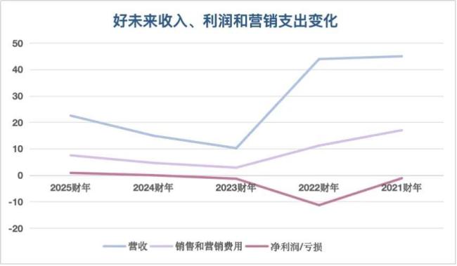 收入、营销费用支出和利润之间存在着一定的关系。以好未来为例,营销费用曲线基本与收入曲线相重合,这意味着营销的手段带来了一定程度上的总营收增长。但过度的营销,则带来了巨额亏损。
