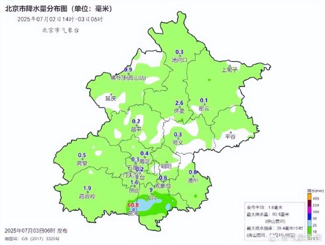 据气象数据显示,从2日14时至3日6时,全市平均降水量为1.8毫米,其中东南部地区如通州、大兴的降水量达到6.2毫米,西南部如门头沟、房山为2.4毫米,东北部如密云、顺义、平谷、怀柔为1.1毫米,西北部如延庆、昌平仅为0.3毫米。城区内最大降水量出现在丰台世界公园,为2.1毫米;全市最大降水量则出现在房山贾河,达到了60.8毫米,最大小时降水强度同样出现在该地,为39.4毫米/小时(发生在2日15时至16时期间)。