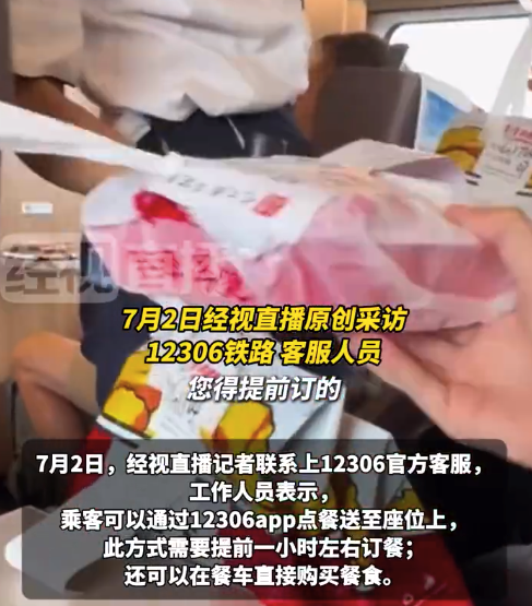 7月2日,12306官方客服表示,乘客可以通过官方app点餐送到座位上,只需要提前1小时左右订餐,还可以在餐车直接购买餐食。工作人员还表示,只持有一段单程车票,是不能从便捷换乘通道进入出发层的,而且每站停留时间较短,如果没能在列车关门前回到车上就需要重新购买车票,此举并不可行。