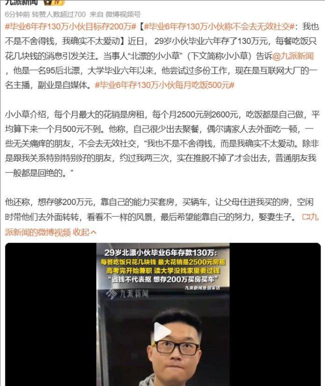 毕业6年存130万小伙每月吃饭500元!一位小伙在毕业六年后存下了130万元,并设定了200万元的储蓄目标。他每个月仅花费500元在饮食上,即便自己做饭在北京也难以想象这种极限的生活方式。根据AI分析,这位小伙的月收入约为21,400元,包括主业和副业的收入。他的月支出为3,350元,其中房租占53%,饮食占15%,其他开销占32%。每月能储蓄18,056元,储蓄率高达84.4%,远高于北京平均储蓄率20-30%。这样算下来,他每年可以储蓄约216,672元,六年累积达到了130万元。平均每月需要储蓄1.8万元,并且坚持了六年,确实非常了不起。