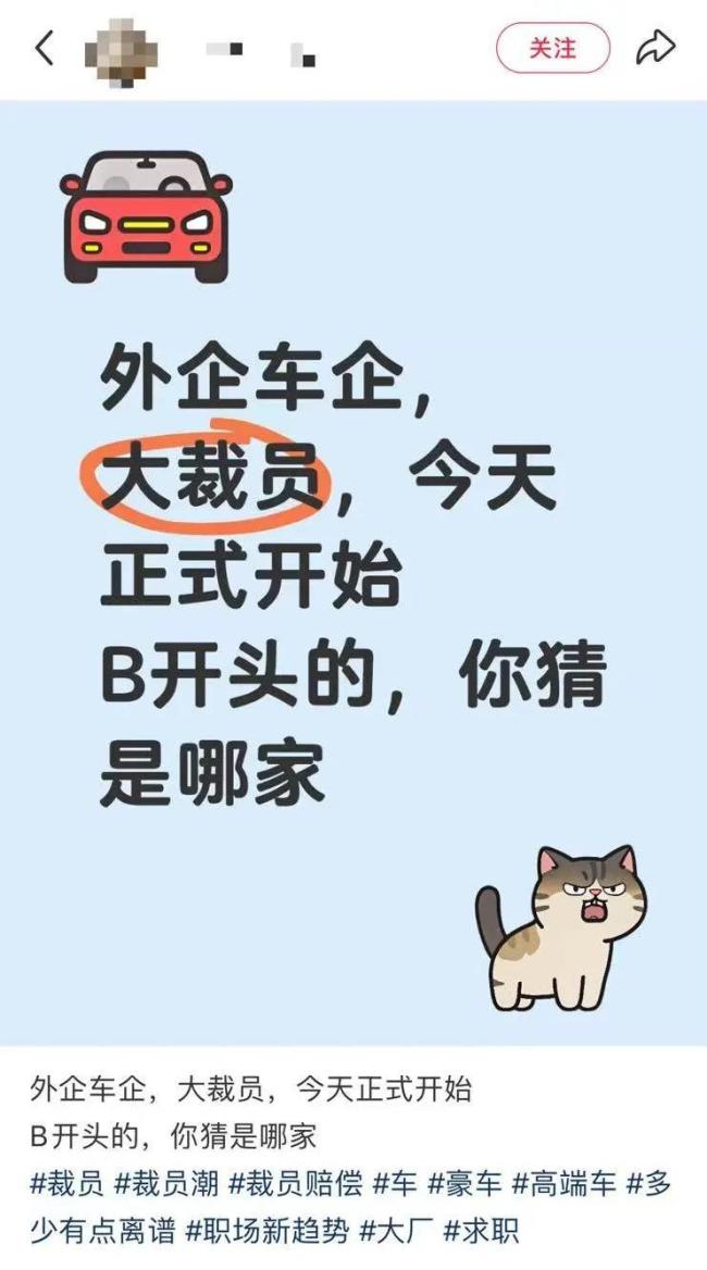 某车企在华裁员:传个别部门裁员比例达70%,赔偿N+3