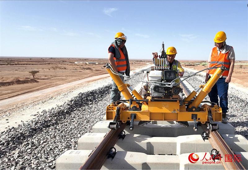 非洲首条沙漠重载铁路优先段轨道铺设现场。人民网记者 郝瑞敏摄