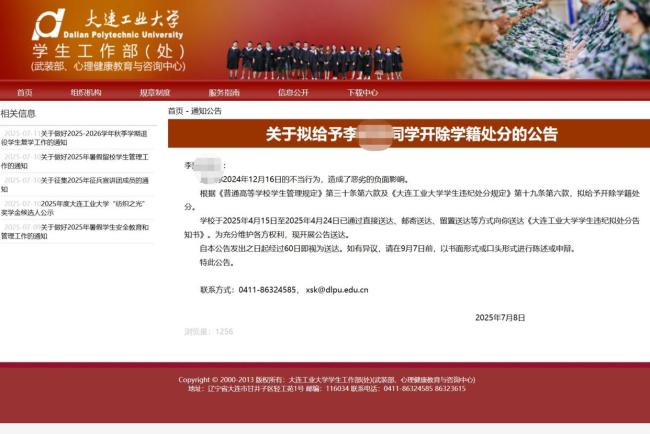 7月8日,大连工业大学学生工作部官网发布《关于拟给予李某某同学开除学籍处分的公告》,几天后引发热议。李某某2024年12月16日与上海CS赛场的外籍男子“Zeus”交往后引发舆情,舆论认为学校基于此事,认为该不当行为造成恶劣负面影响,因而拟对其开除学籍。