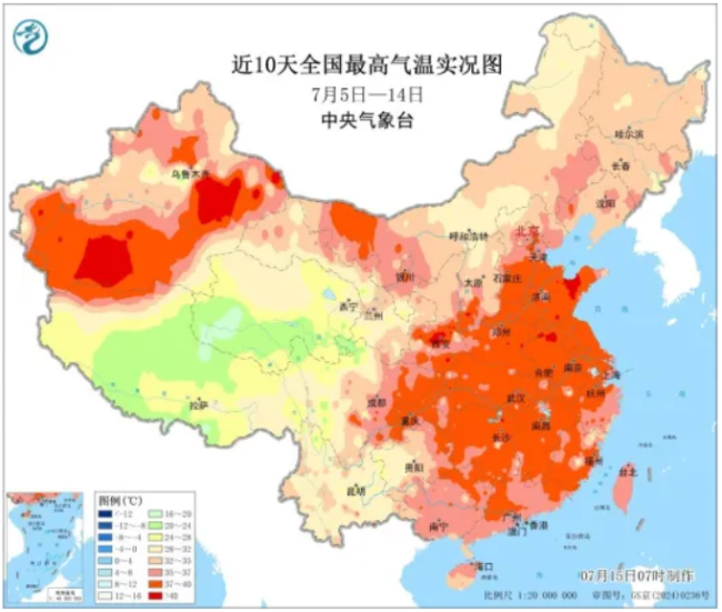 通过中央气象台发布的近10天全国最高气温实况图(7月5日-14日)观察,山东、河南、江苏、浙江、湖北等省份普遍超过37℃。值得关注的是,纬度较高的东北地区(辽宁、吉林和黑龙江三个省份),也罕见地出现了超35℃的高温,叠加热穹顶现象,体感上湿热难耐。作为曾经的“空调洼地”,东北地区在高温炙烤下也沦陷了。