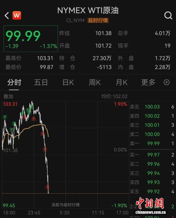 国际油价跳水 WTI原油失守100美元