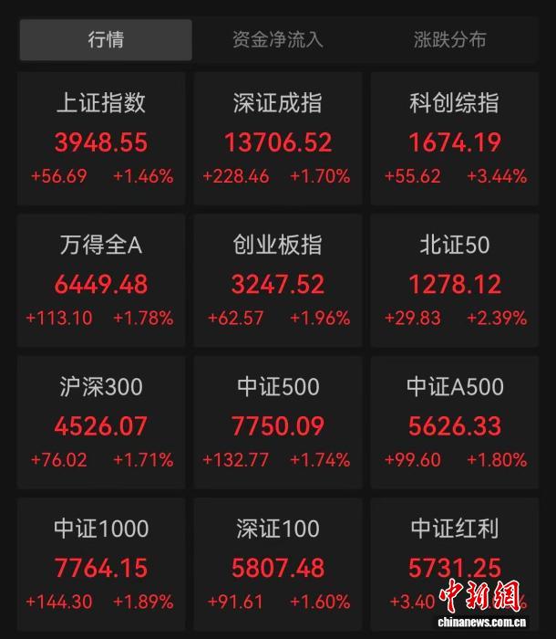 中新网4月1日电 (记者 谢艺观)1日,A股三大股指集体收涨。截至收盘,沪指涨1.46%,深证成指涨1.7%,创业板指涨1.96%。全市全天成交额超2万亿元,近4500只个股上涨。生物科技、海运、制药等行业板块涨幅居前。(完)