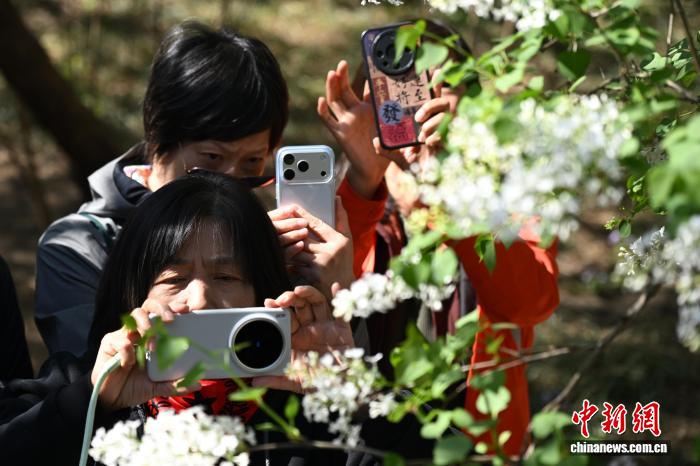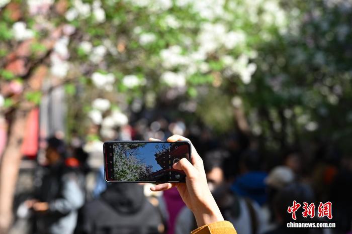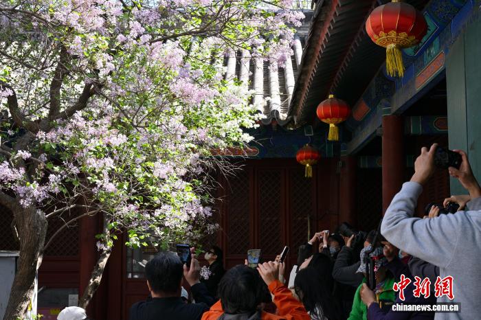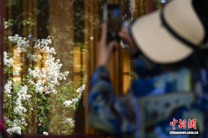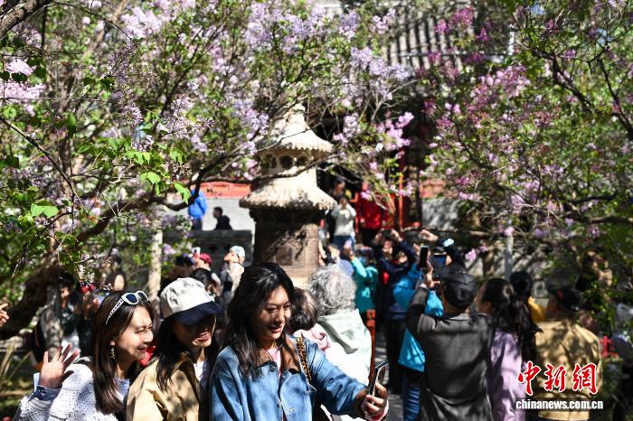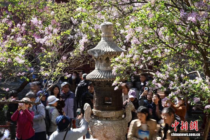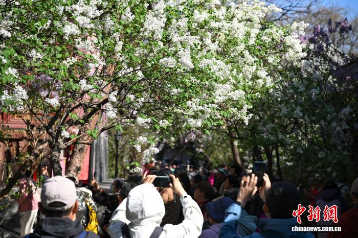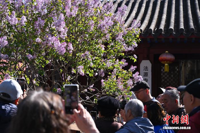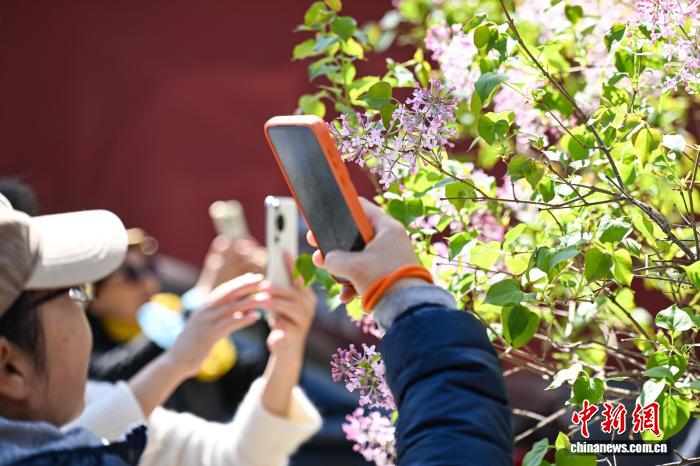 4月1日,游客在法源寺拍摄绽放的丁香花。中新社记者 田雨昊 摄