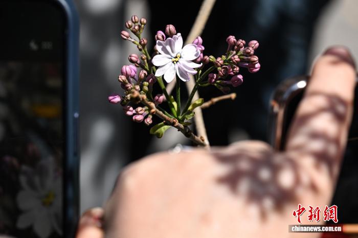 4月1日,游客在法源寺拍摄一朵绽放12片花瓣的丁香花。中新社记者 田雨昊 摄