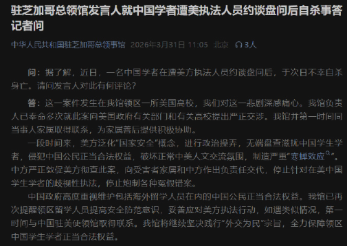 3月31日中午,中华人民共和国驻芝加哥总领事馆发布公众号,回应近期中国学者遭美执法人员约谈盘问后自杀事。问:据了解,近日,一名中国学者在遭美方执法人员约谈盘问后,于次日不幸自杀身亡。请问发言人对此有何评论?答:这一案件发生在我馆领区一所美国...