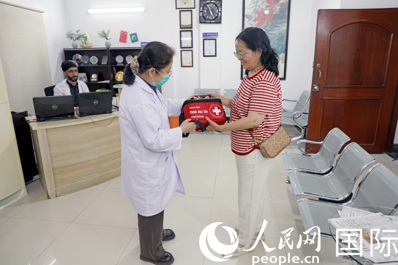 义诊期间,巴基斯坦岐黄中医中心的医生向在巴中国公民发放医疗急救包。人民网记者 赵益普摄